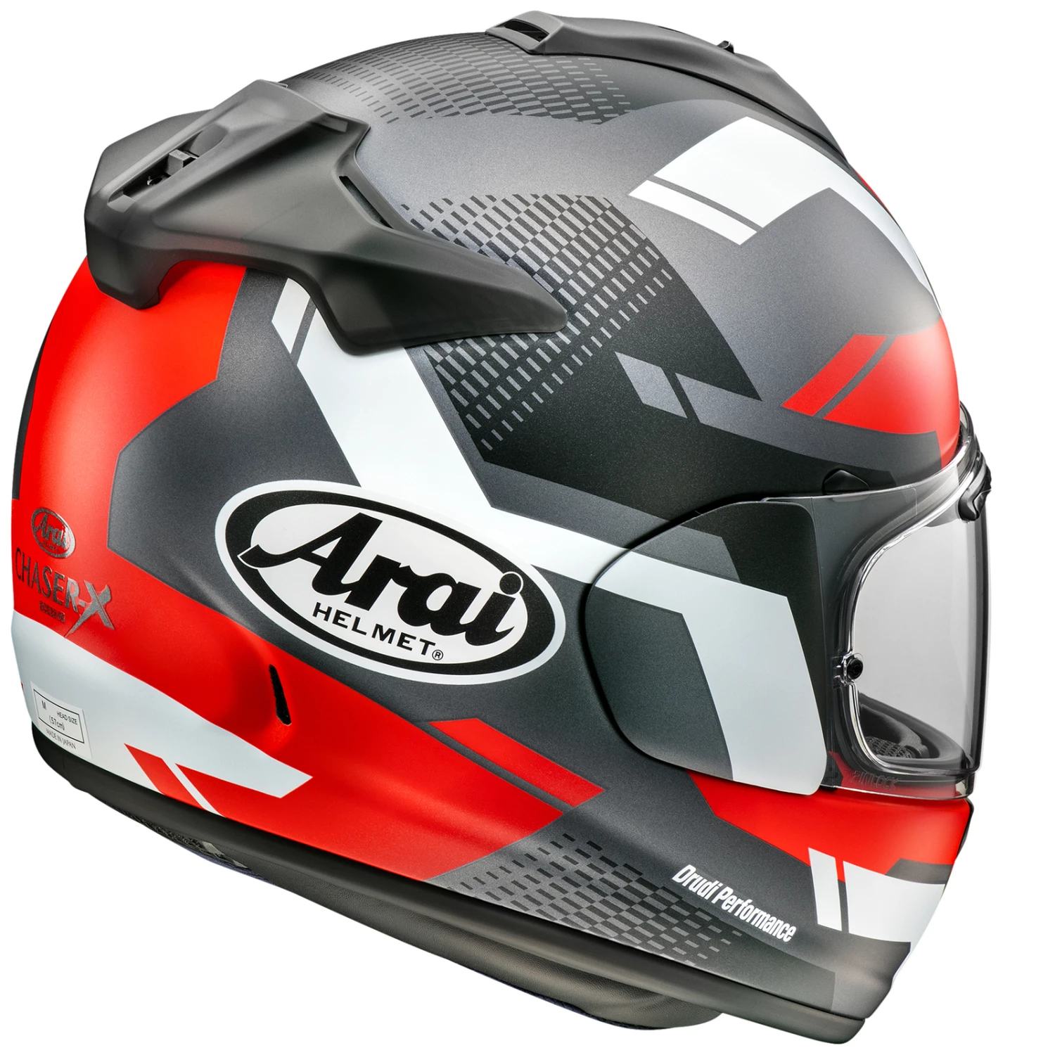 Chaser-X is the third Arai helmet that makes use of the new VAS (variable Axis System) technology that offers a significantly larger and smoother shell area above the SNELL test line greatly improving the important helmet glancing off performance. The Chaser-X makes use of an also completely new ventilation system derived from the RX-7V, instantly recognizable by the large, single intake duct on top of the helmet. This Top Ventilation System is derived from the RX-7V diffuser system. The replaceable interior is lined with an anti-microbial fabric. The Chaser-X features FCS (Facial Contour System) and a fixed, non-retractable mini chin cover. The chin vent is also new, while the Formula One developed visor lock system is the same as used on the RX-7V.