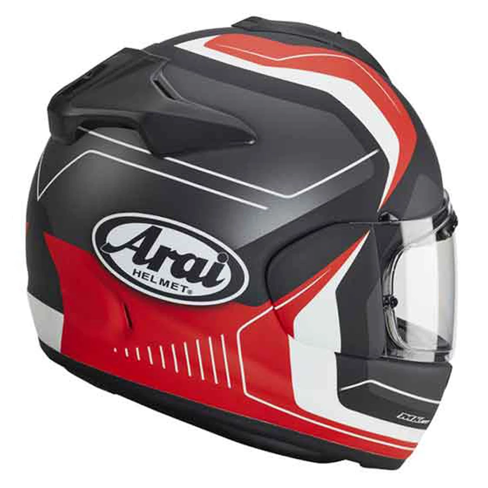 Chaser-X is the third Arai helmet that makes use of the new VAS (variable Axis System) technology that offers a significantly larger and smoother shell area above the SNELL test line greatly improving the important helmet glancing off performance. The Chaser-X makes use of an also completely new ventilation system derived from the RX-7V, instantly recognizable by the large, single intake duct on top of the helmet. This Top Ventilation System is derived from the RX-7V diffuser system. The replaceable interior is lined with an anti-microbial fabric. The Chaser-X features FCS (Facial Contour System) and a fixed, non-retractable mini chin cover. The chin vent is also new, while the Formula One developed visor lock system is the same as used on the RX-7V.
