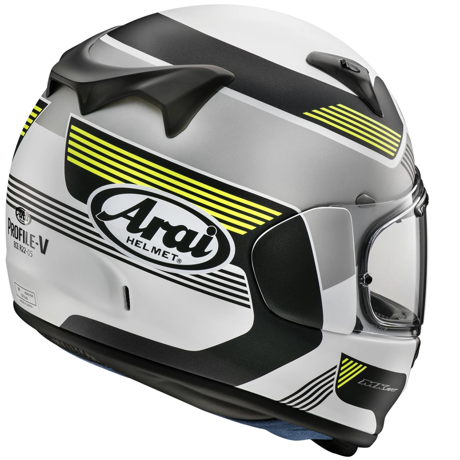 The Arai Profile-V Helmet is a first-rate helmet that welcomes riders to Arai’s exceptional build quality, materials and design. Its redesigned opening makes it easy to put the helmet on or take it off. PB-cLc shell construction is stiff and lightweight to meet Snell certification. With an intermediate oval head shape, the Profile-V fits those with heads that are slightly longer front to back compared to side to side. The multi-density EPS is a single piece that allows Arai to provide protection where it is needed most while still providing a low profile lightweight helmet. The Variable Axis System (VAS) provides a pivot point for the face shield that moves so the face shield can be mounted lower on the helmet while still having enough clearance to open the face shield. The VAS Shield Latch System holds the face shield securely closed or it can be opened slightly to allow venting. The top padding cannot be removed, but cheek pads can be removed for cleaning or replacement. The Arai Profile-V Helmet fine tunes Arai’s features to embrace riders looking for a comfortable, protective and premium helmet.